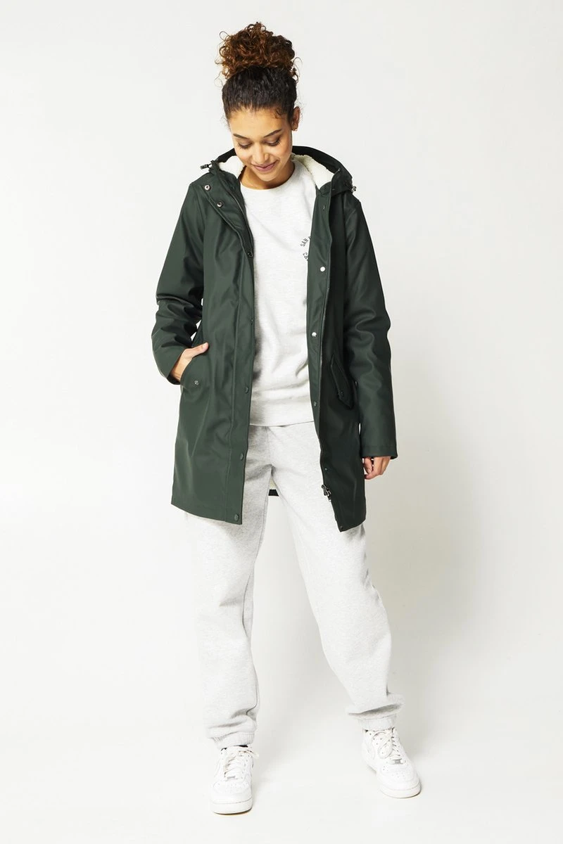 America Today dames regenjas. De Janice teddy is een lange regenjas met capuchon ideaal voor op de fiets. De capuchon kan doormiddel van een trekkoord aangetrokken worden voor extra bescherming. Daarnaast is de regenjas voorzien van een rits- en drukknoopsluiting en twee steekzakken met drukknoopsluiting. De teddy binnenstof houd je lekker warm tijdens de koude regen dagen. Product details: • Straight fit • Vaste capuchon • Teddy binnenkant • Rits- en drukknoopsluiting