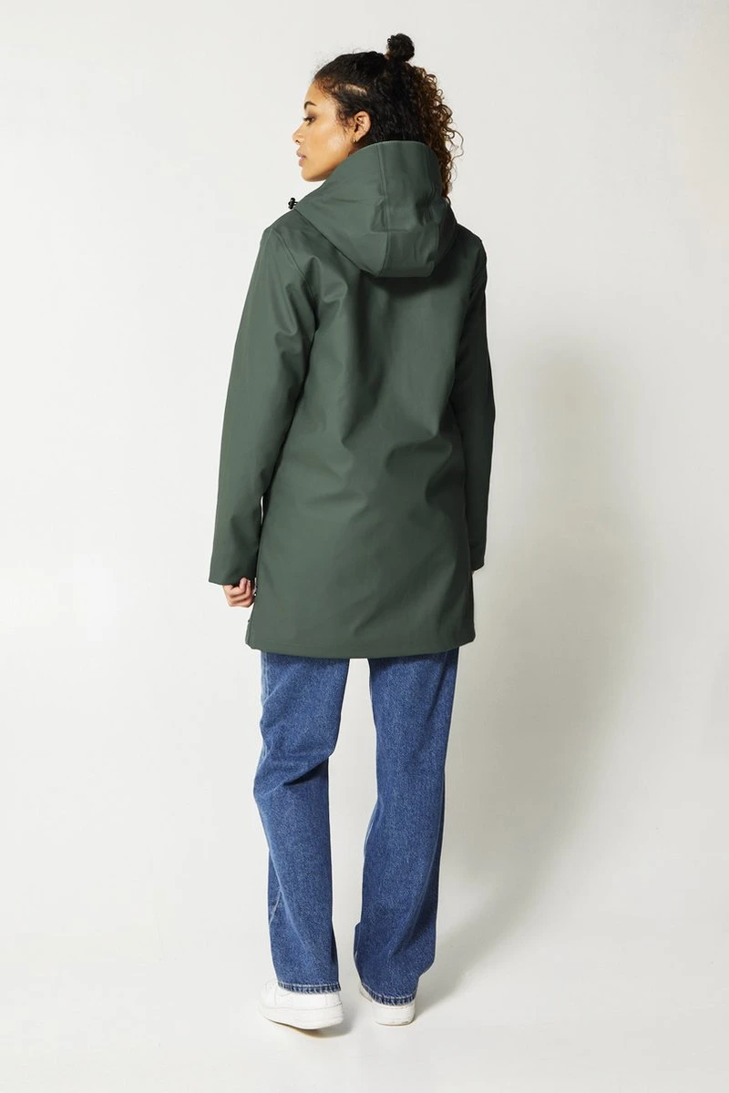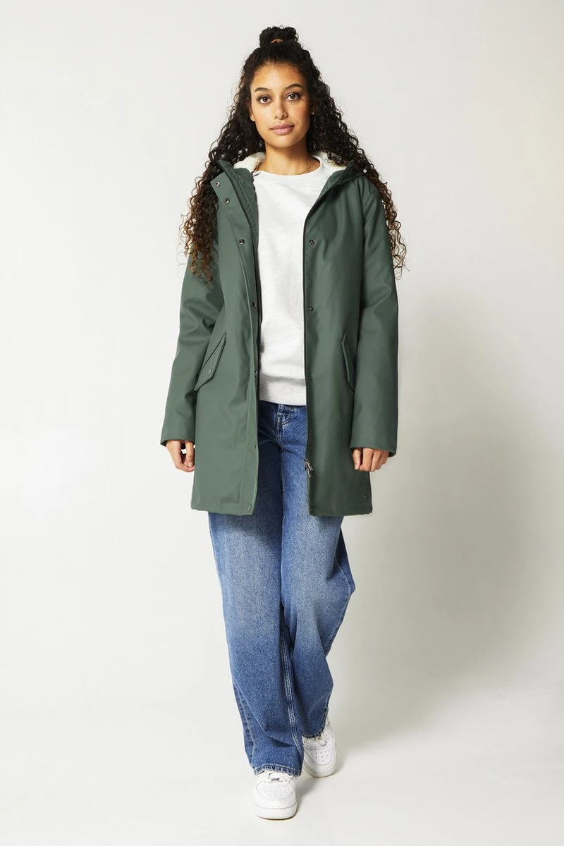 America Today dames regenjas. De Janice teddy is een lange regenjas met capuchon ideaal voor op de fiets. De capuchon kan doormiddel van een trekkoord aangetrokken worden voor extra bescherming. Daarnaast is de regenjas voorzien van een rits- en drukknoopsluiting en twee steekzakken met drukknoopsluiting. De teddy binnenstof houd je lekker warm tijdens de koude regen dagen. Product details: • Straight fit • Vaste capuchon • Teddy binnenkant • Rits- en drukknoopsluiting