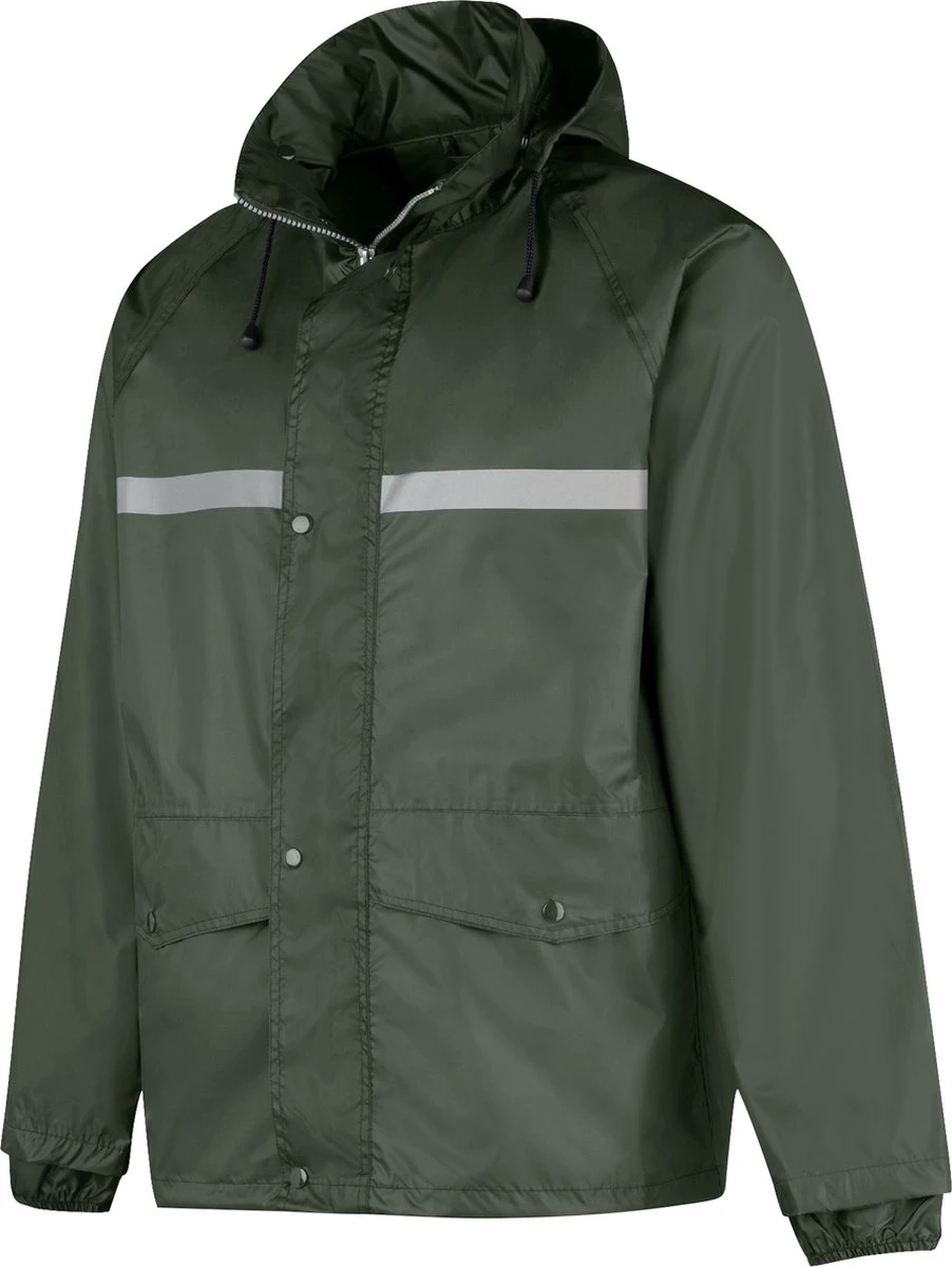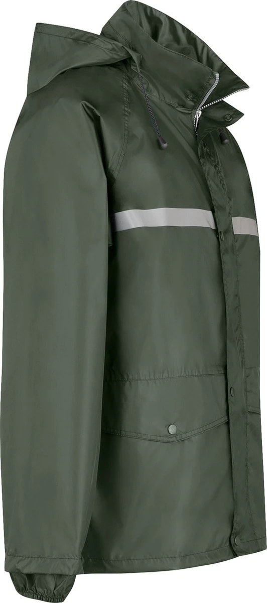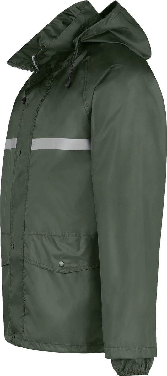 De rits van de regenjas is verdekt met een beschermende flap met drukknopen. De capuchon is afritsbaar en verstelbaar met een koord. Ook de taille boord is verstelbaar met een elastisch koord. De mouwen hebben elastische manchetten. De jas heeft twee heupzakken met knoopsluiting. Het is een ruime fit waardoor de jas goed over kleding is te dragen. De regenjas is voorzien van reflectie op de borst en rug voor extra zichtbaarheid in het donker.
