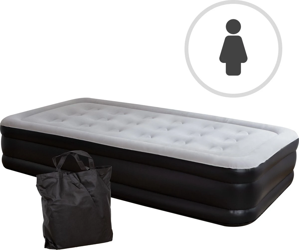 Het luchtbed heeft een zachte bovenkant van grijs velours en een verhoging van 36 cm, zodat u er ‘s nachts niet af kunt rollen en het aanvoelt als een echt bed. Dankzij de naadloze lastechniek en kwalitatieve dikke materiaal is het bed volledig luchtdicht, lekbestendig, waterafstotend en bestand tegen beschadigingen. Bovendien zorgt de antislip onderkant voor extra stevigheid.