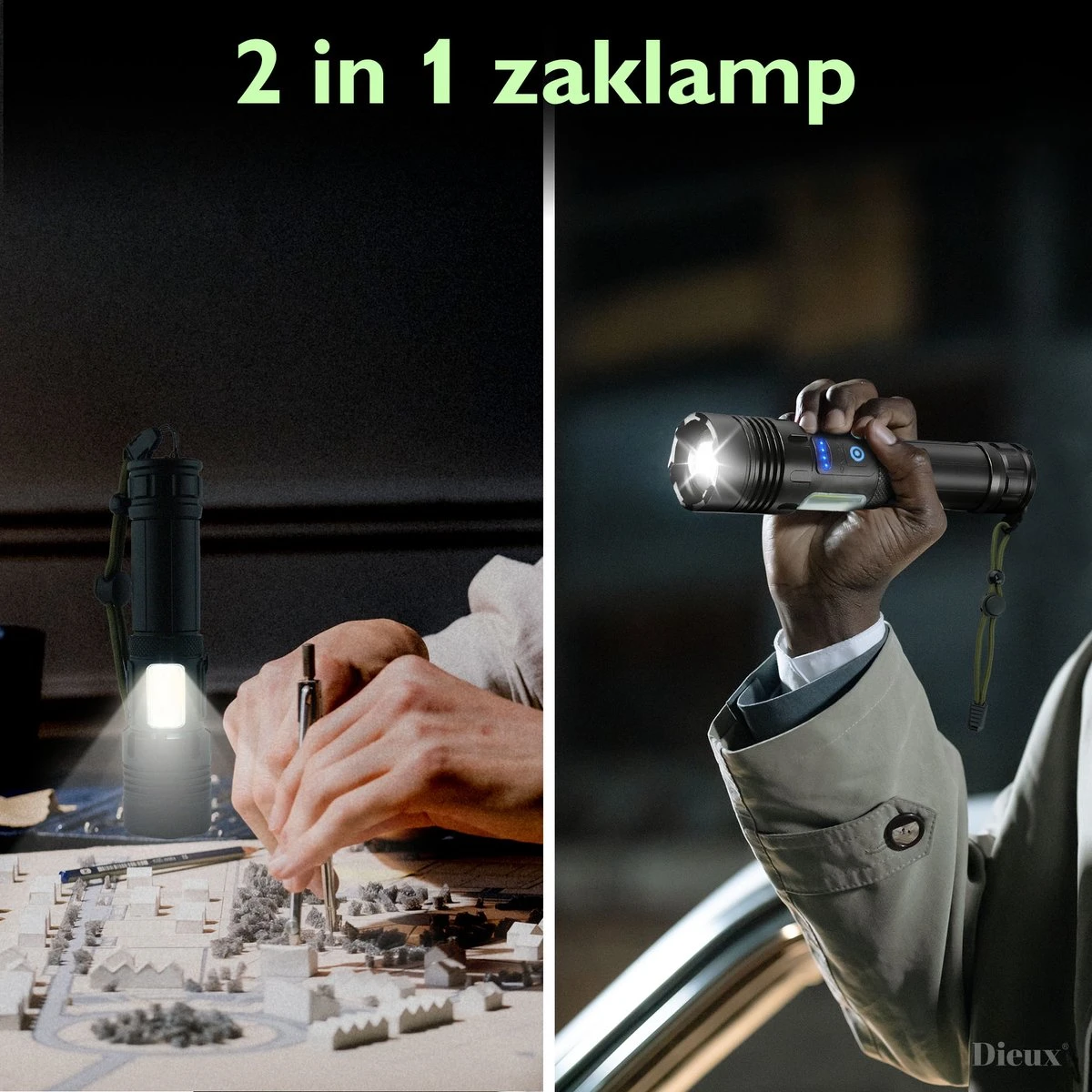 Meer helderheid in het donker? Doe dan nu jezelf of een ander deze hoogwaardige Dieux 2-in-1 LED zaklamp cadeau.