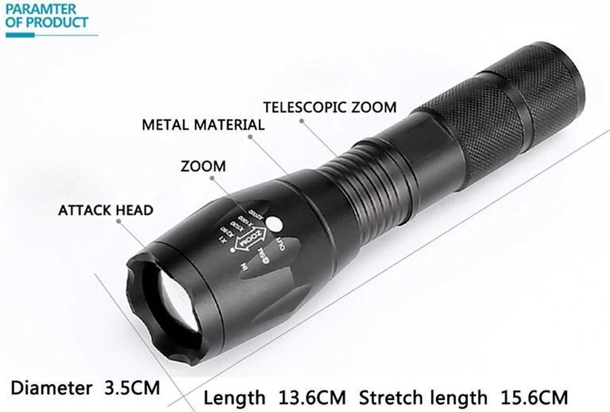 【ZOOMABLE FLASHLIGHT & ADJUSTABLE FOCUS】 Onze zaklampen maken gebruik van de nieuwste duurzame CREE XML T6 LED-chip en bieden een superheldere lichtstraal. Deze hoogwaardige CREE LED-zaklamp ondersteunt afstand met een eenvoudig te bedienen hoofdtrekzoom en eenvoudige modusschakelaar door licht op een knop te tikken. U kunt het focusbereik aanpassen voor ander gebruik, uitrekken om de focus aan te passen en de spotstraal en schijnwerpers te krijgen die u nodig hebt. Super heldere zoombare focus, perfect voor observatie op afstand en verlichting met een groot bereik.