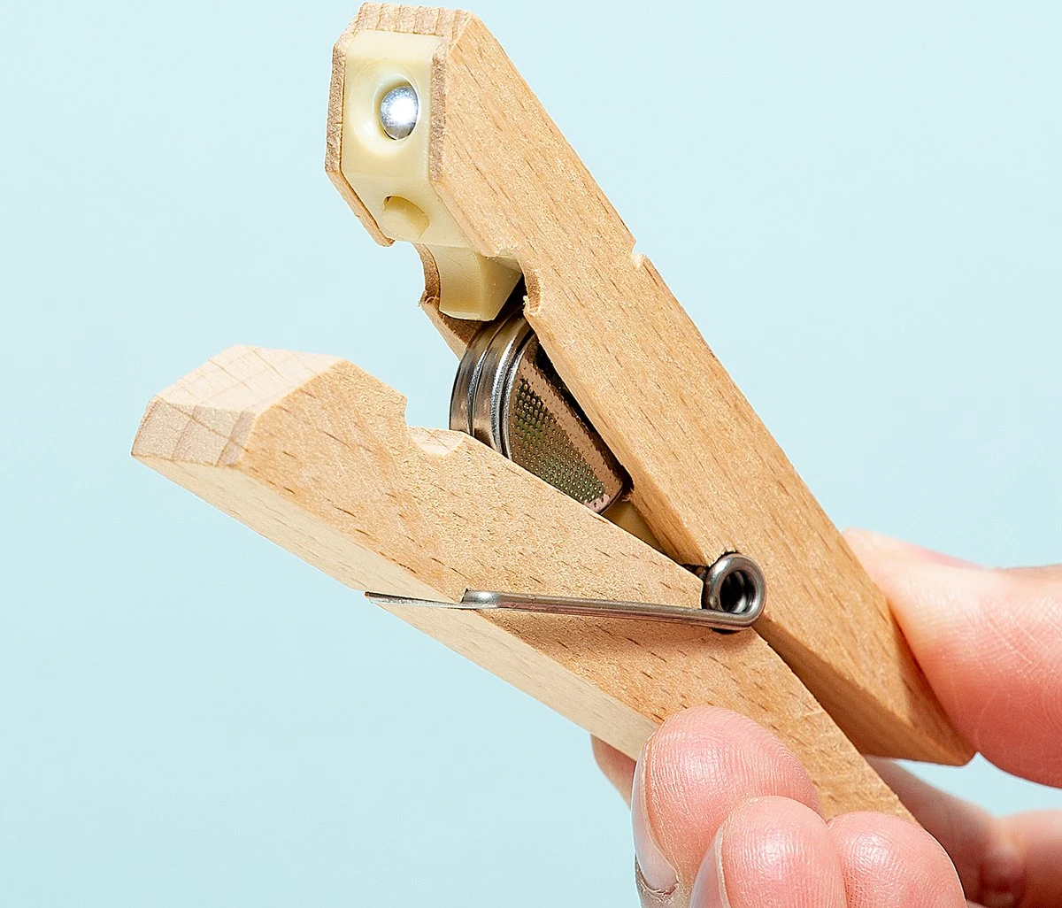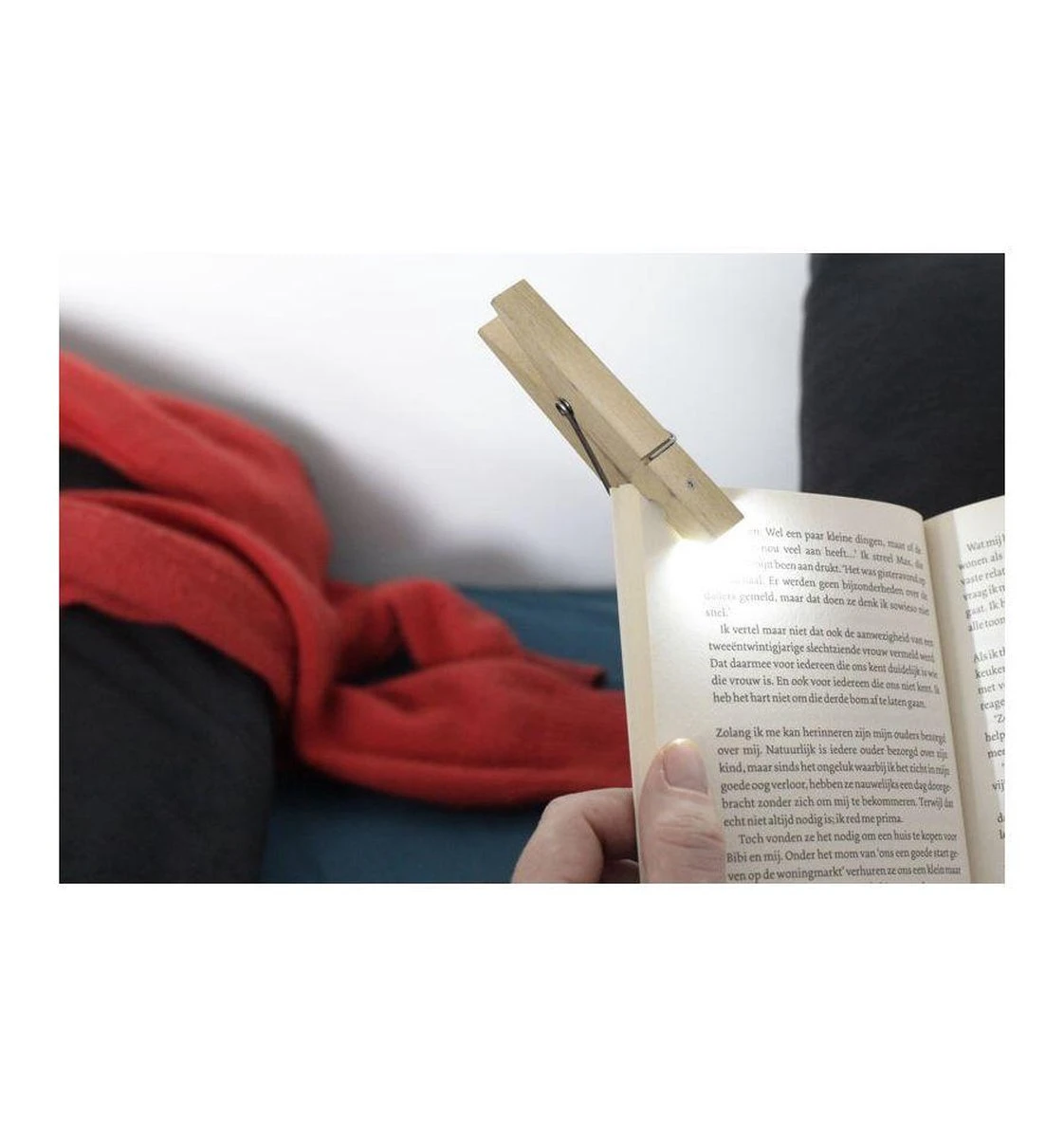 Wasknijper clip light van Kikkerland. Lampje in de vorm van een wasknijper, die je op een boek kunt clippen. De wasknijper is gemaakt van hout en is voorzien van een LED-lampje. Het is een ideaal leeslampje voor in bed, zonder dat iemand anders las heeft van het licht. Ook leuk en handig om mee te nemen op vakantie, als je bijvoorbeeld tijdens het kamperen nog wilt lezen. Het wasknijper lampje werkt op twee CR2032 batterijen (inbegrepen).