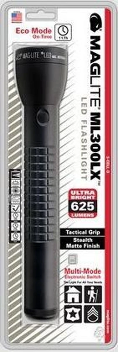 De MagLED ML300LX staaflamp van MagLite USA heeft een zeer krachtige lichtbundel met een lichtopbrengst van 625 Lumen. De moderne MagLED technologie maakt van de klassieke 3D-cell staaflamp van 295 mm een technologisch geavanceerd lichtinstrument. De staaflamp heeft een draaibare kop voor het focussen van de lichtbundel. Vervaardigd van zwart geanodiseerd corrosievrij aluminium. Mat oppervlak met grip in wafeldesign. Shock-/waterproof. Gemaakt om een leven lang mee te gaan. De C-cell en D-cell lampen worden vooral daar gewaardeerd, waar men op licht moet kunnen vertrouwen. Het sterke licht, de hoogwaardige kwaliteit en hun betrouwbaarheid maken ze tot een veilige en robuuste aanwinst voor professionals. MagLite staaflampen zijn daarom vaak standaard voor politie, reddingsdiensten en brandweer in de VS. En niet alleen daar. Exclusief 3 x D-cell batterij. MagLite geeft een beperkte levenslange garantie van 10 jaar. In doos.