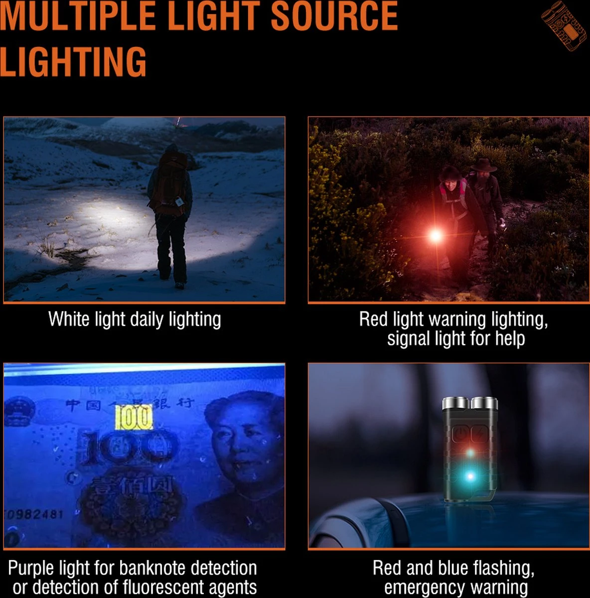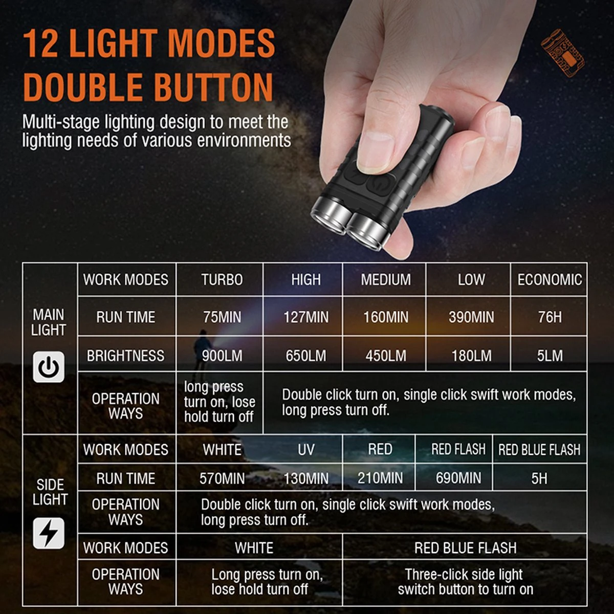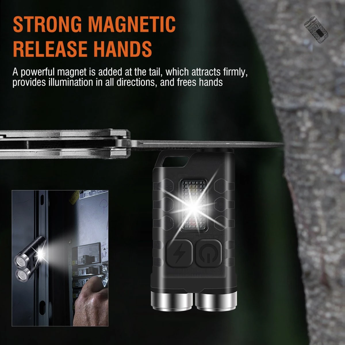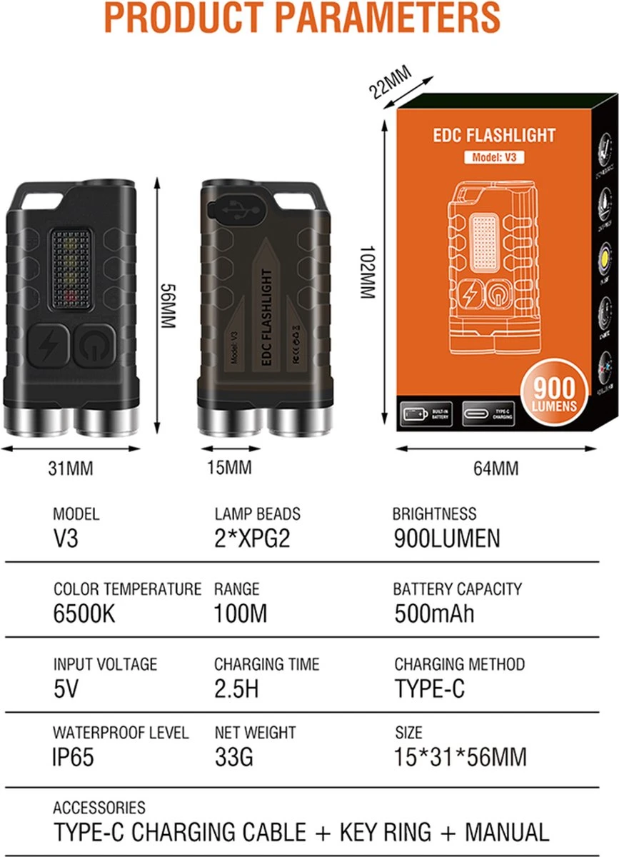 【Sleutelhanger LED-zaklamp】De mini LED-sleutelhangerzaklampen hebben 12 lichtmodi, tot 900 lumen in de extreem heldere modus, en de staart heeft een adsorptiefunctie, gecombineerd met het zijlichtwaarschuwingsflitsapparaat, kan het worden geadsorbeerd op het dak van de auto wordt een noodwaarschuwingslamp.