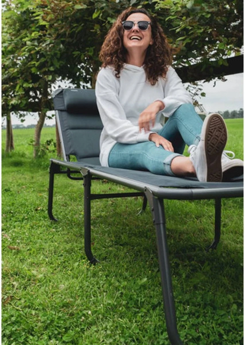 Het Barletta ligbed is gevoerd met zachte, ventilerende Airmesh-stof die heerlijk comfortabel aanvoelt. Ook is het ligbed dankzij deze stof bestand tegen alle weeromstandigheden. Airmesh is namelijk voorzien van openingen, waardoor water na een regenbui niet blijft zitten en de stoel heerlijk luchtdoorlatend is op een warme zomerdag. Wil je jouw ligbed mee op vakantie nemen? Dat is geen probleem! Je kunt hem compact opvouwen en vervolgens meedragen aan de inbegrepen draagriem. Dat wordt heerlijk ontspannen naast de camper of caravan.